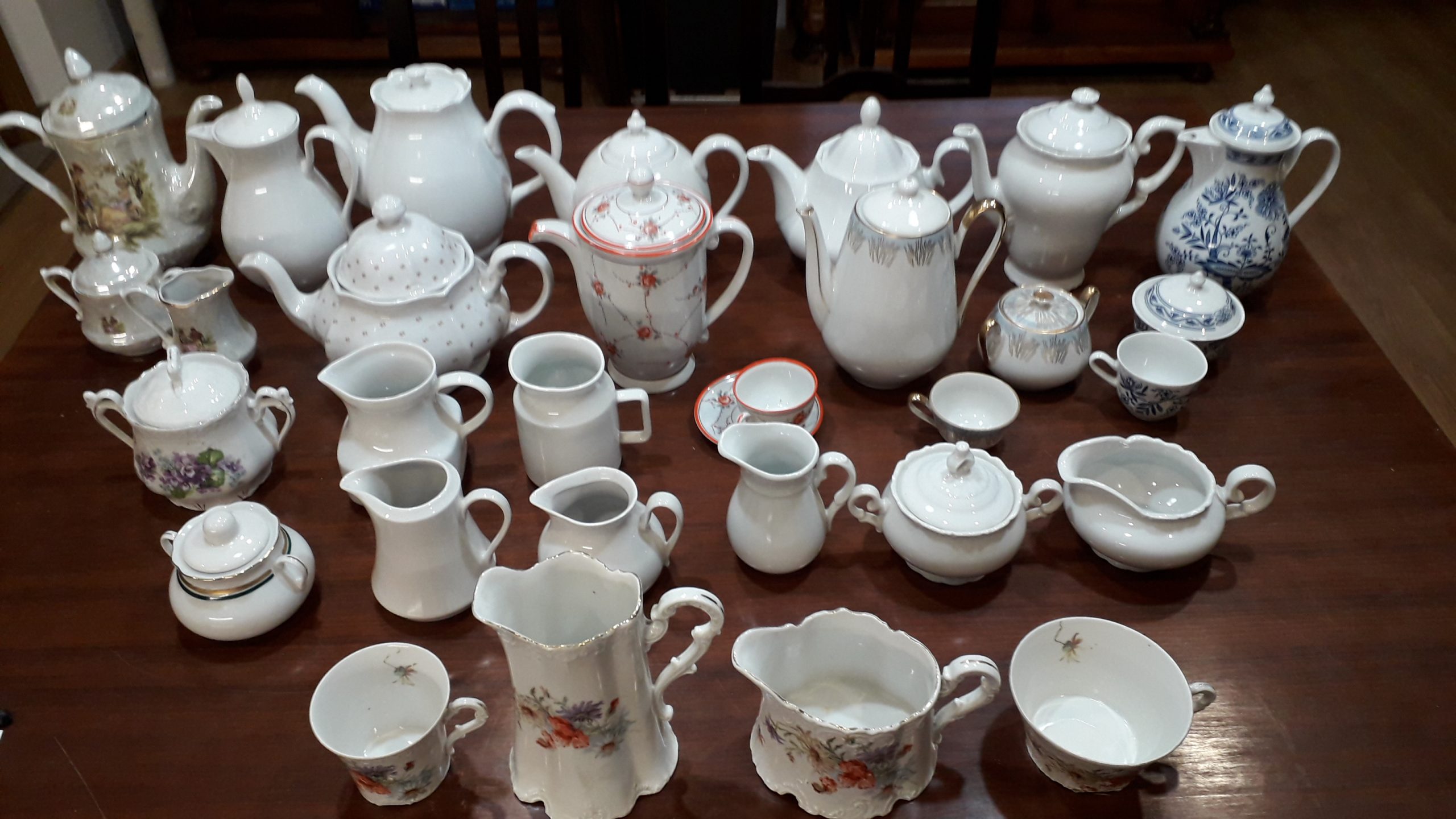 -čajníky vysoké s uškom a pokrievkou: 20cm súdok 3€ + detto širší 1,25l 3,5€ + 16cm guľa Bohemia ČSSR 4€ + 12-hran 16cm 1,1l 3,5€ + hruška 19cm Epiag ČSSR 4€