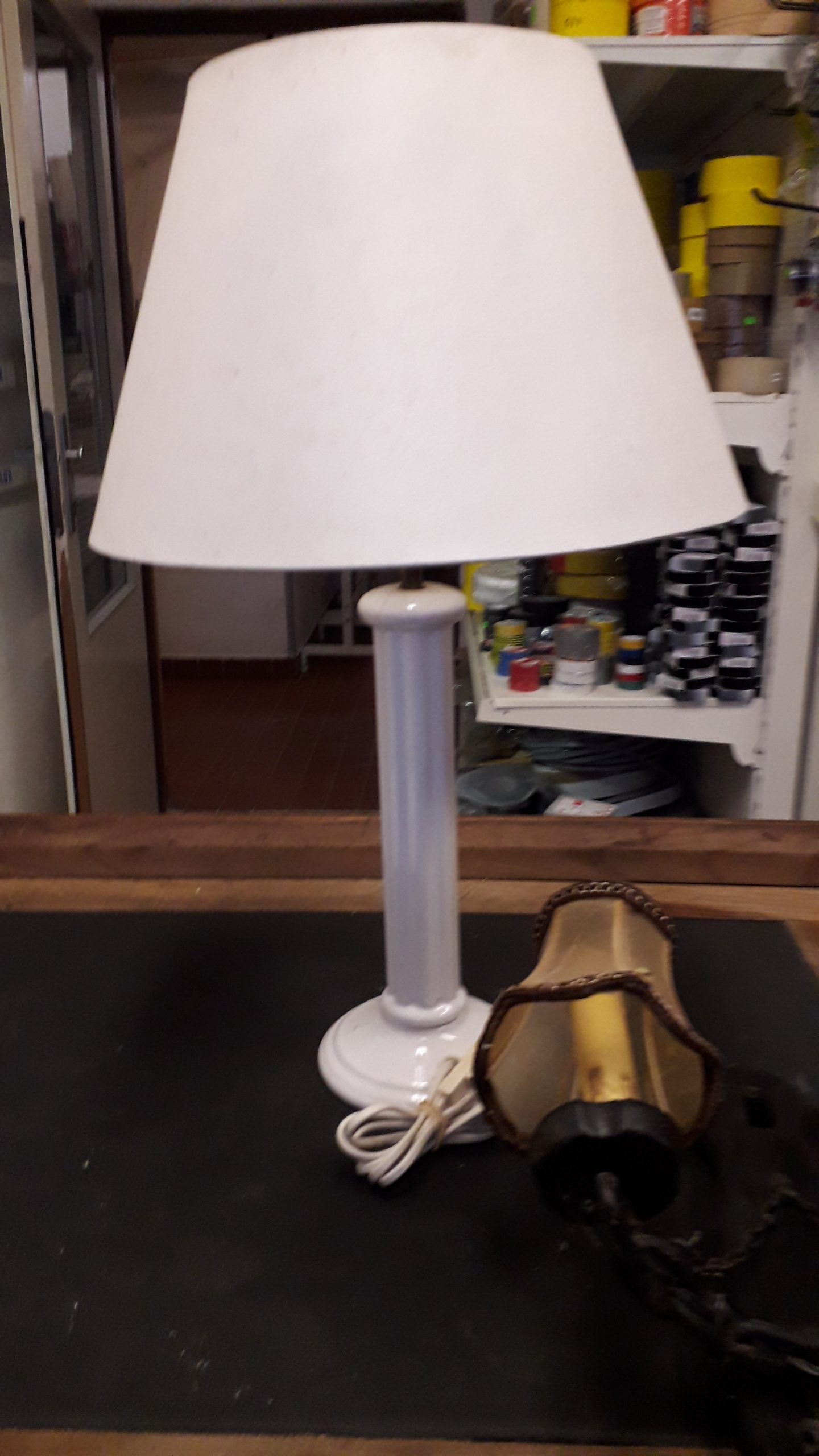 a) stolná biela E27 keramická, šnúrový vypínač výška 60cm 9€