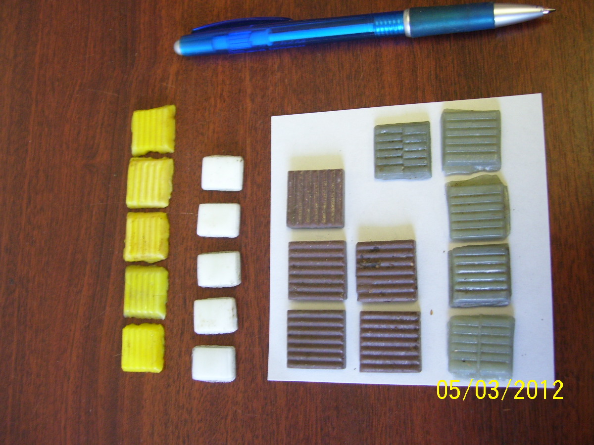20x20mm (á 5g) a 13x17mm ( á 2,5g )sklenené? rôzne farby 2€/kg (1m2=2-3tis.ks=6kg=12€/m2)